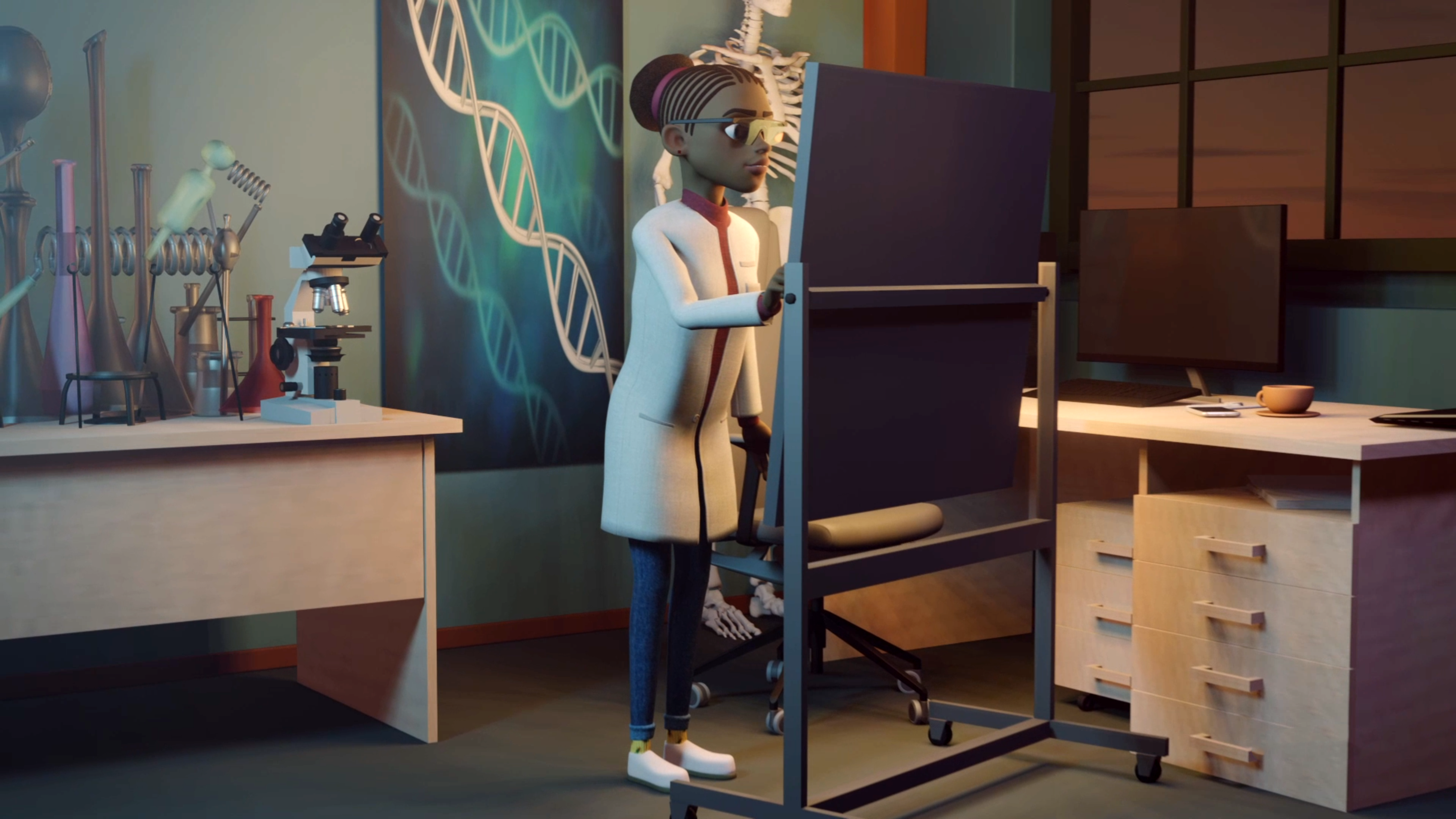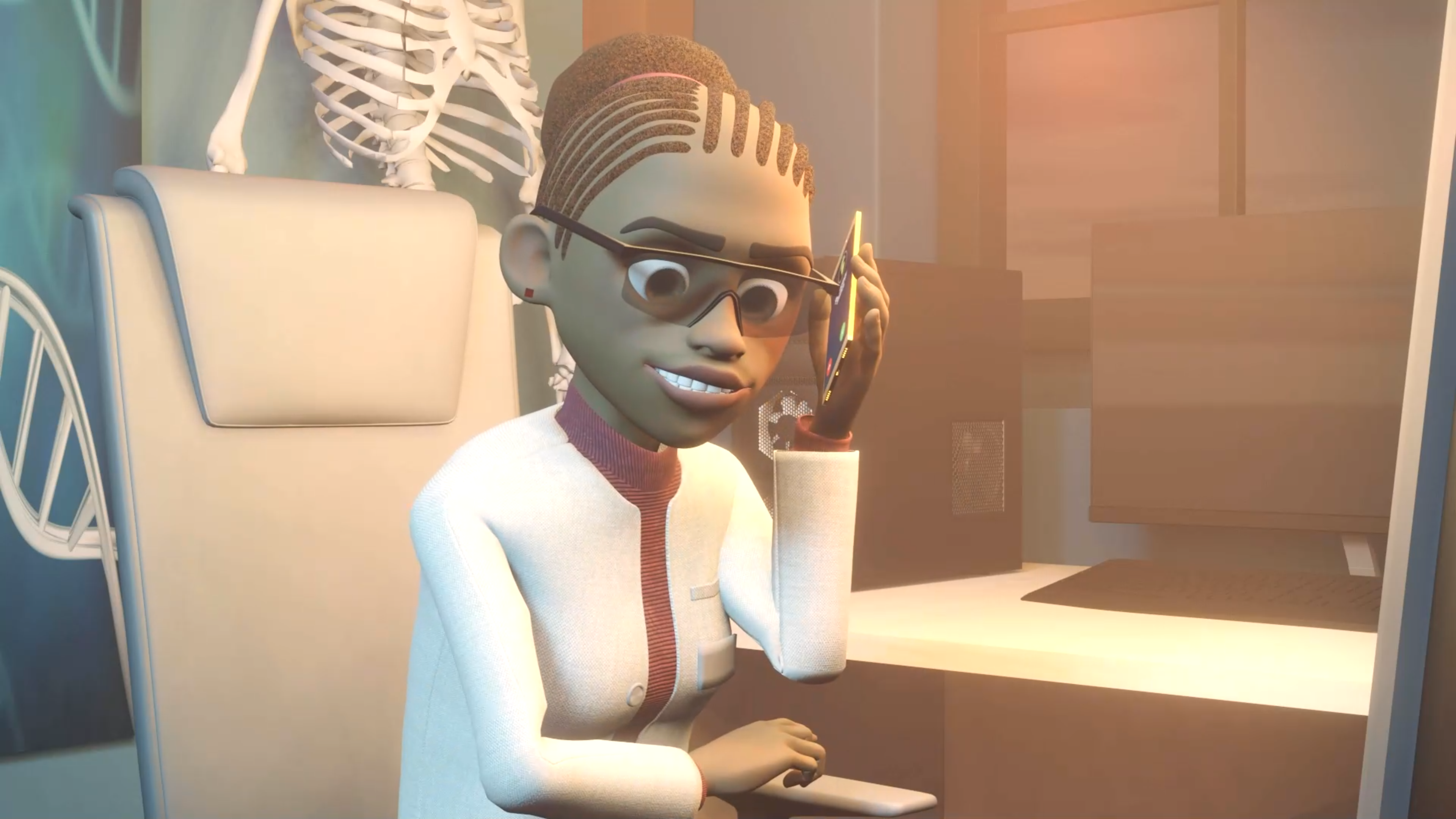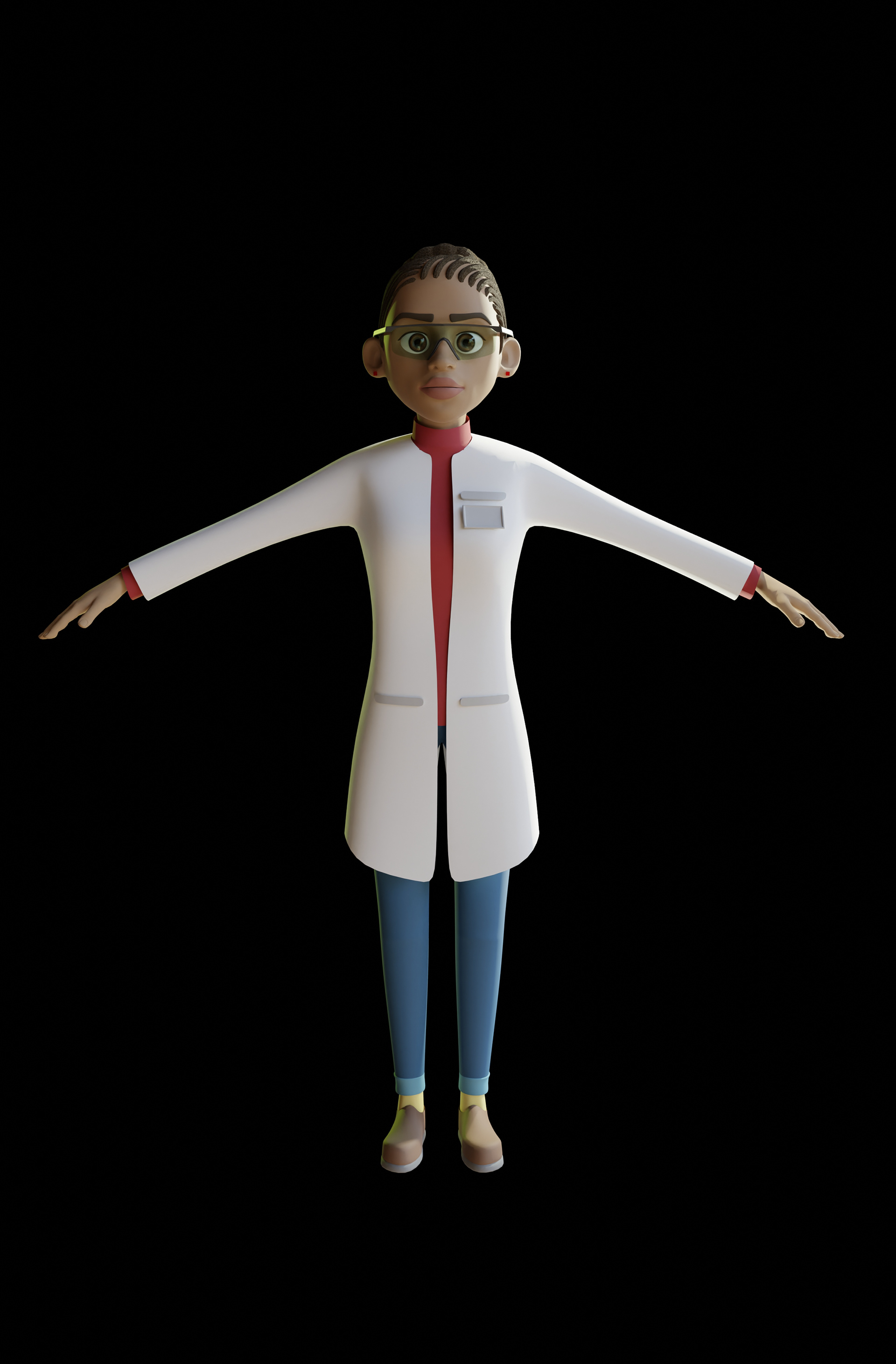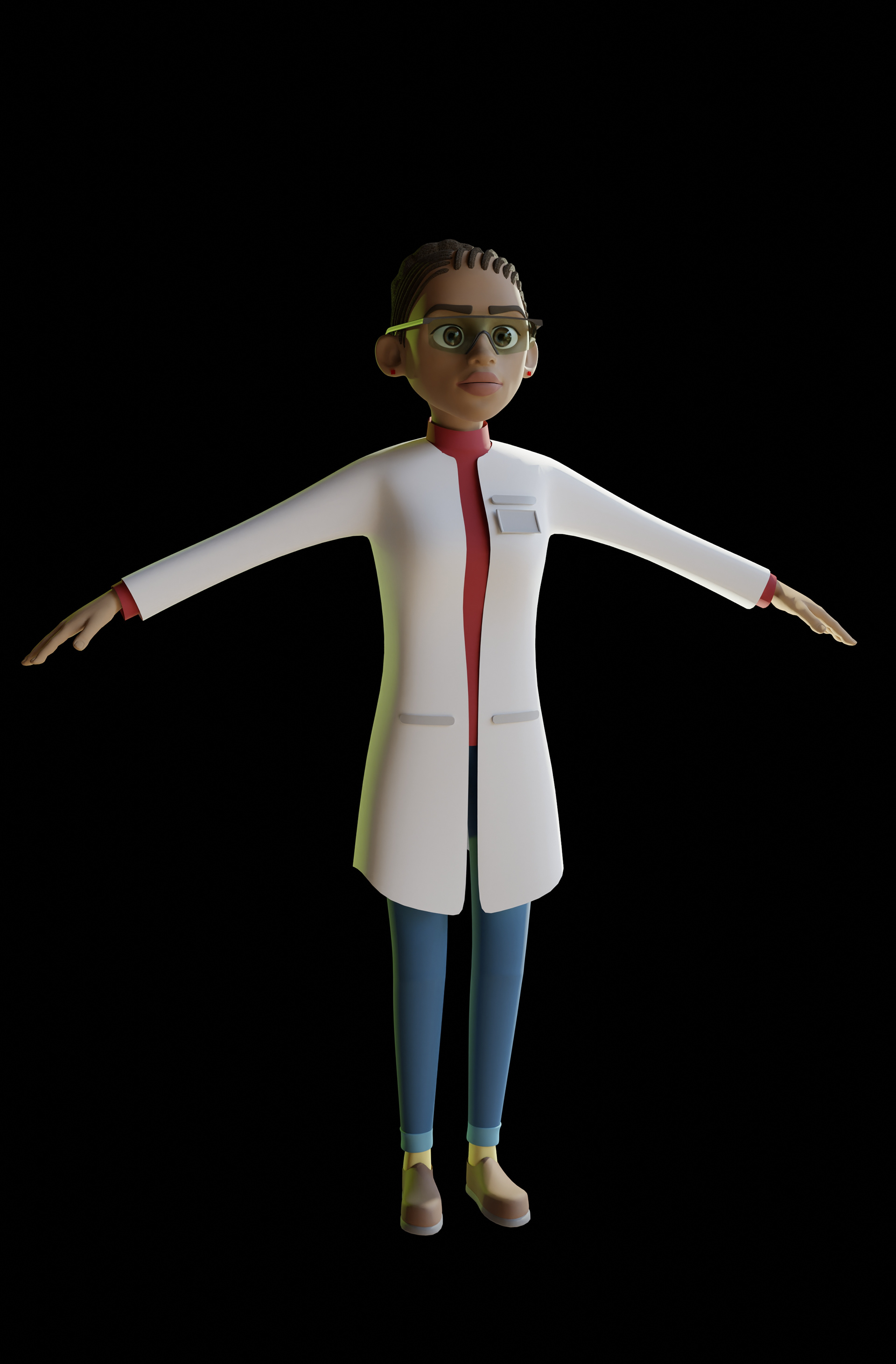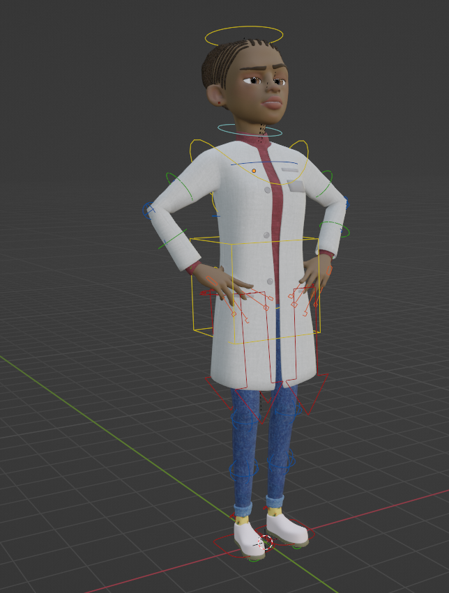 We custom created all the characters in the video within Blender and our main source of inspiration was to create a Disney-esque character with wide large eyes and a symmetrical body structure. We crafted a character called Riya who was our African american medical professional who can be seen in her lab coat in our high resolution renders below.